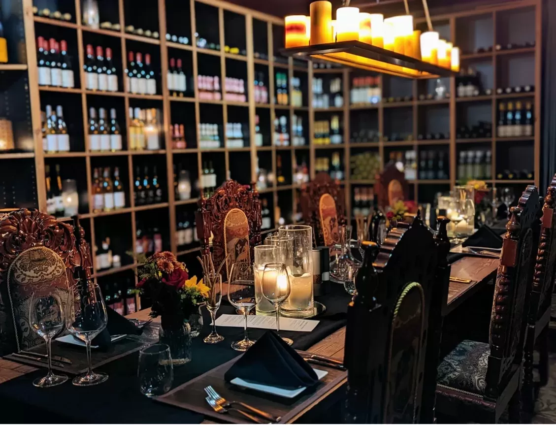 This luxurious European-style dining room, is furnished with imported Louis XIV-style chairs, a rich mahogany-stained table, and an extensive wine collection featuring selections ranging from local favorites to exotic treasures.