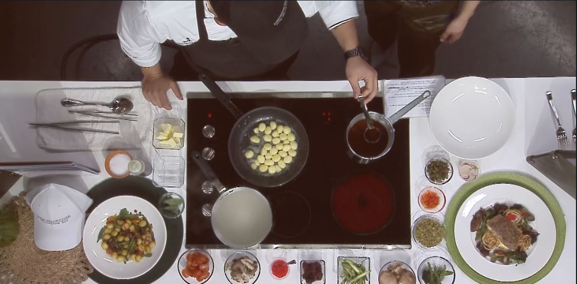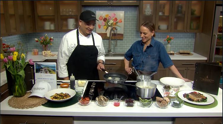 The dish: a pan-fried gnocchi with spring vegetables in sage brown butter. Pillowy gnocchi, crisped in butter for a golden crust, meets tender asparagus, shiitake and oyster mushrooms, and blistered cherry tomatoes — all finished with a drizzle of parsley oil. “Always season while you’re cooking,” Chef Anzaldua and the host agreed.