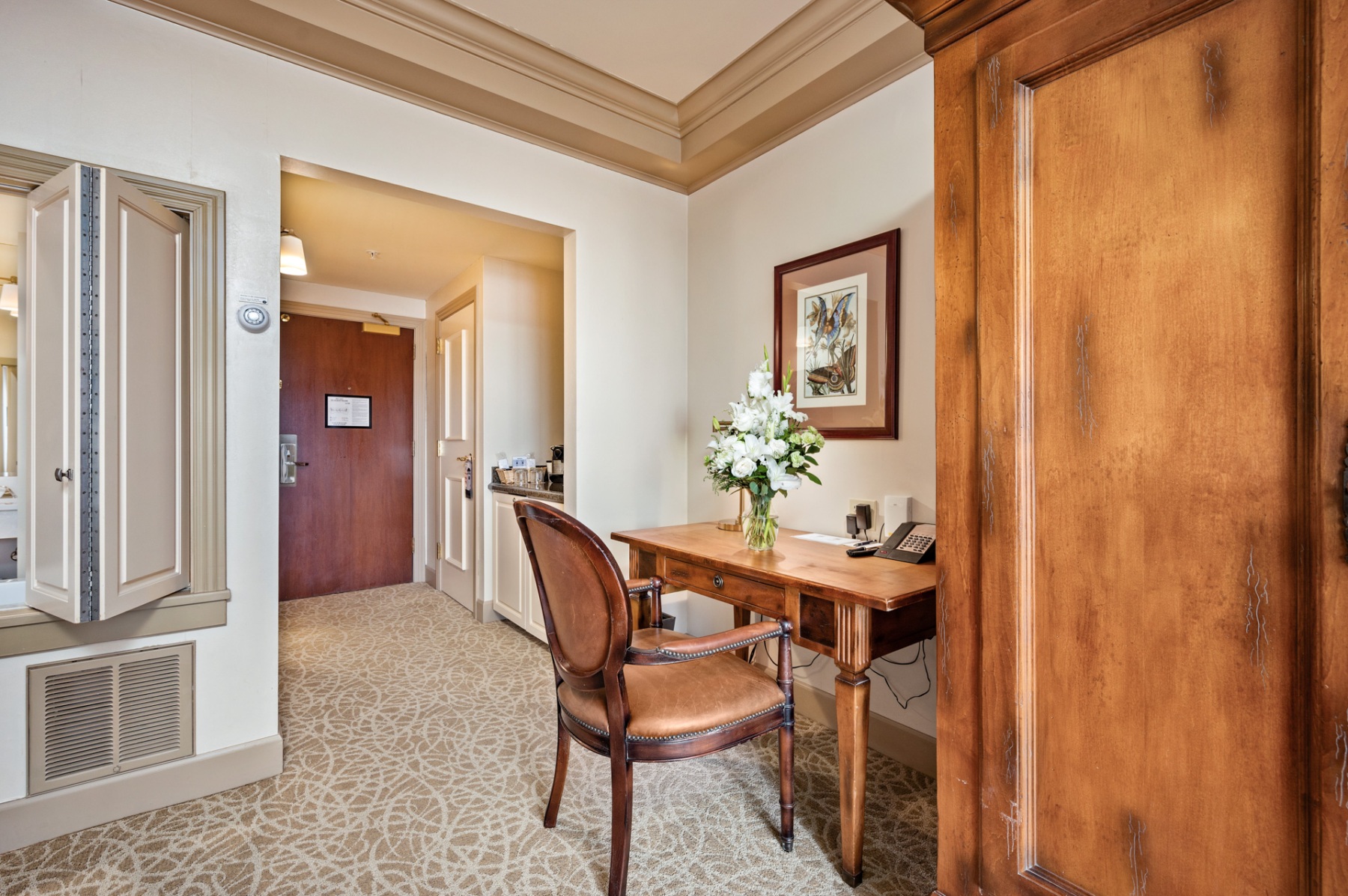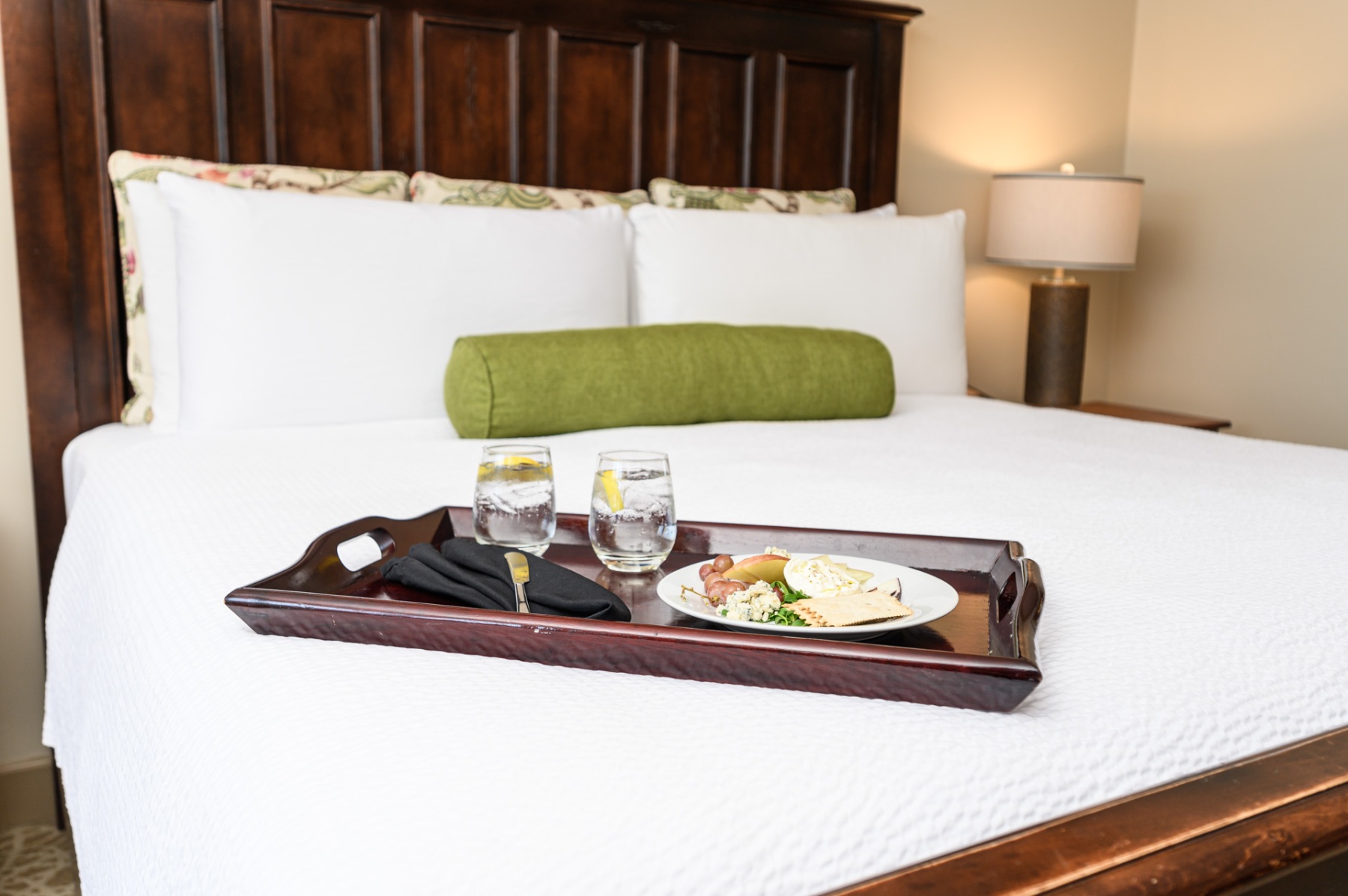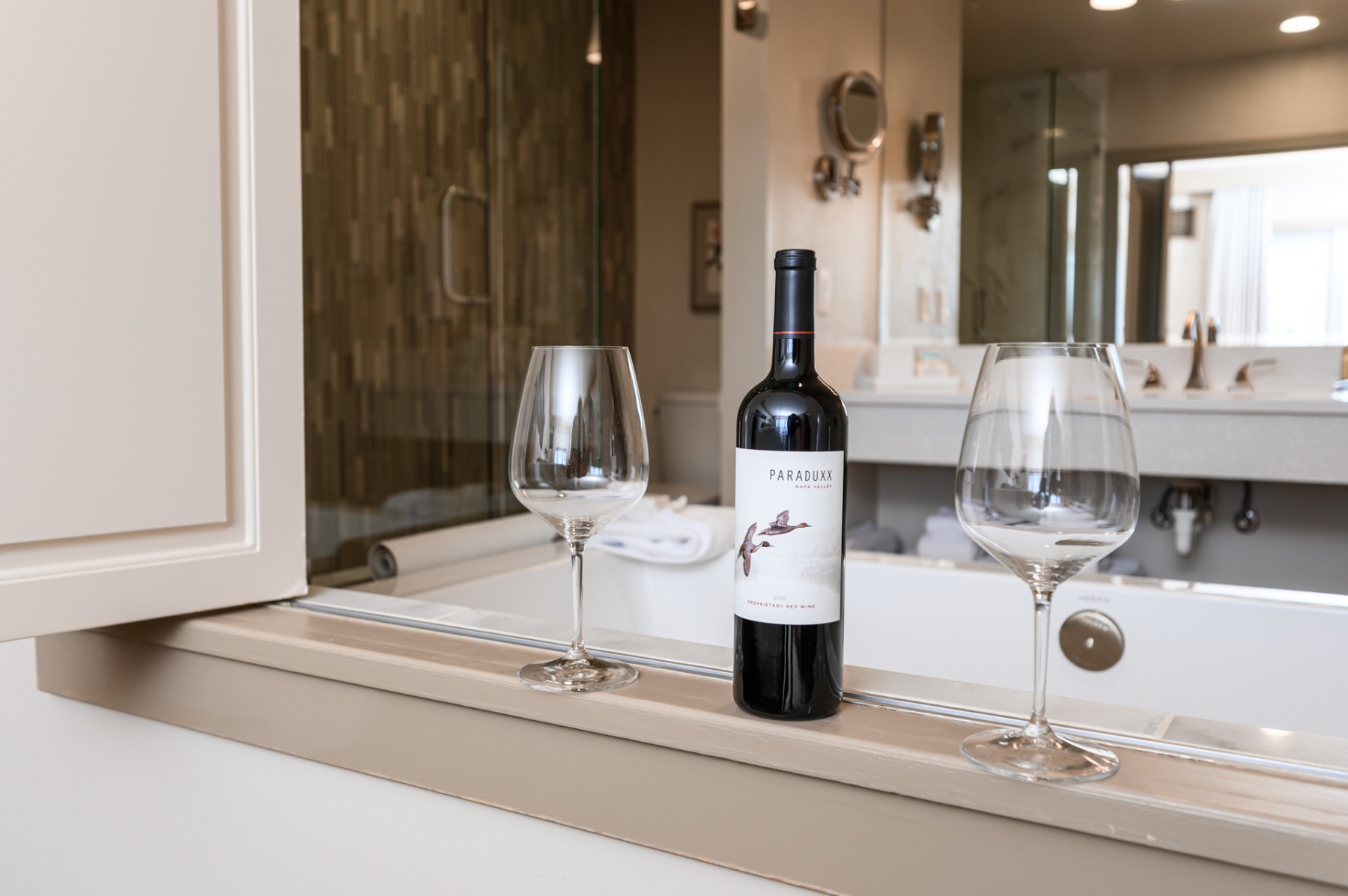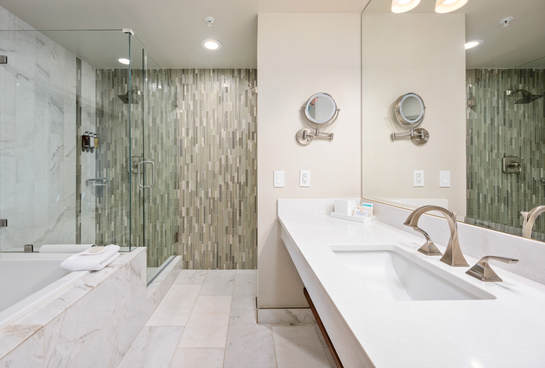 Each includes a soft, King bed with over-sized, Hungarian down embroidered pillows and textured white comforters. Cozy up to a natural gas fireplace and bathe in the deep jetted or soaking bathtub with peekaboo views through the room. A luxurious glass, walk-in shower is trimmed with a waterfall of pleasing gray vertical tiles and lavish hardware. Each room is accented by enormous, light-filled windows that bathe the room in natural sunlight. Room darkening shades keep the light out to spend your mornings in dark, lazy luxury.