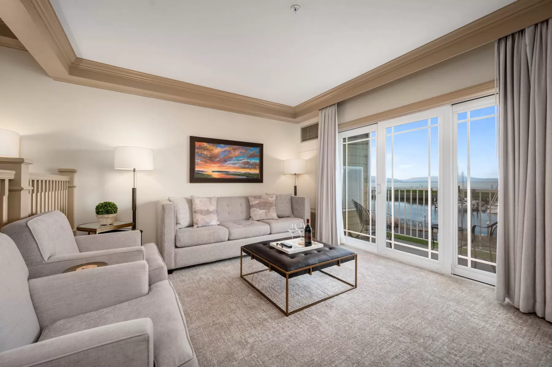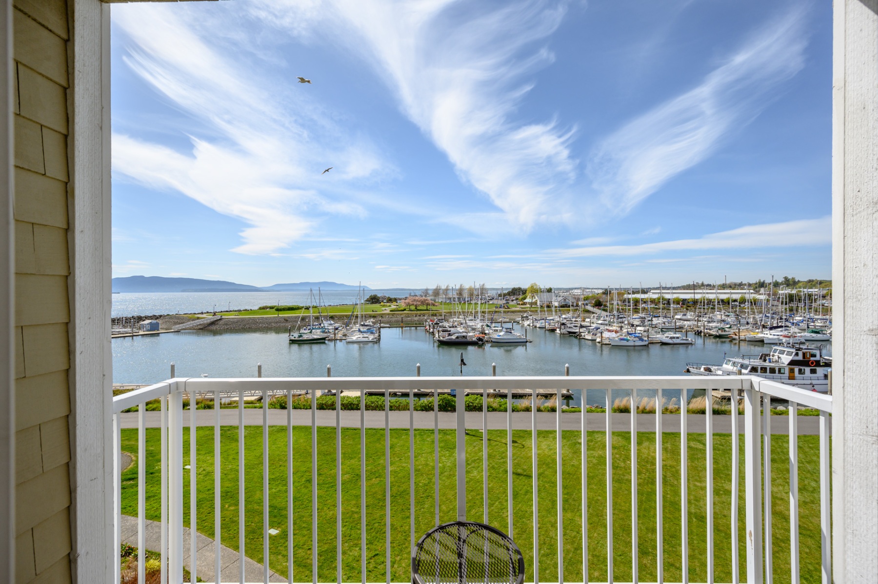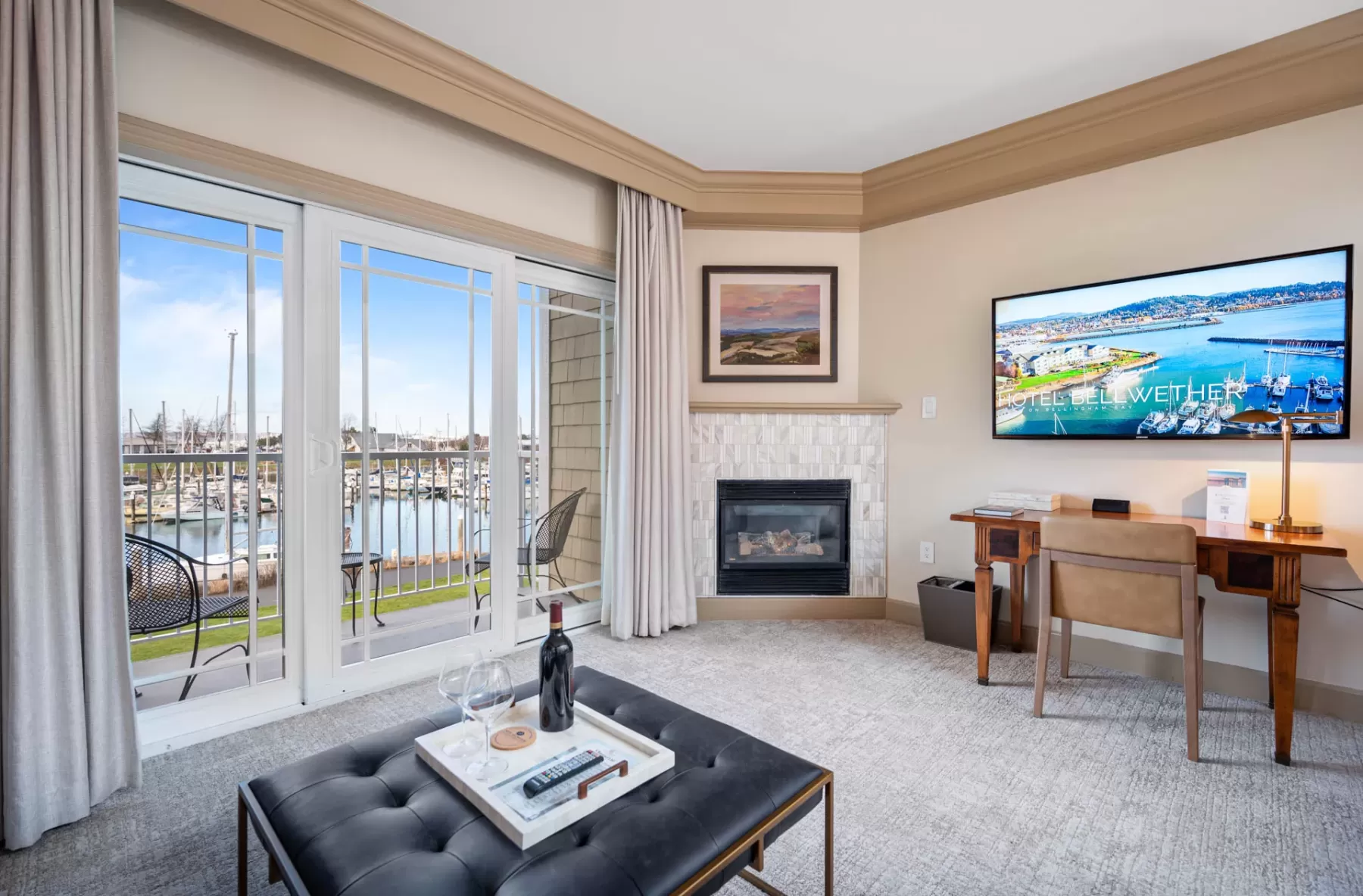Our Deluxe Bay View Suites offer private balconies with breathtaking views of Bellingham Bay and the Squalicum Harbor. Luxury amenities include plush furnishings, king-size bed, bathroom with a relaxing air-jetted tub and separate walk-in shower, an expanded living area with a natural gas fireplace.