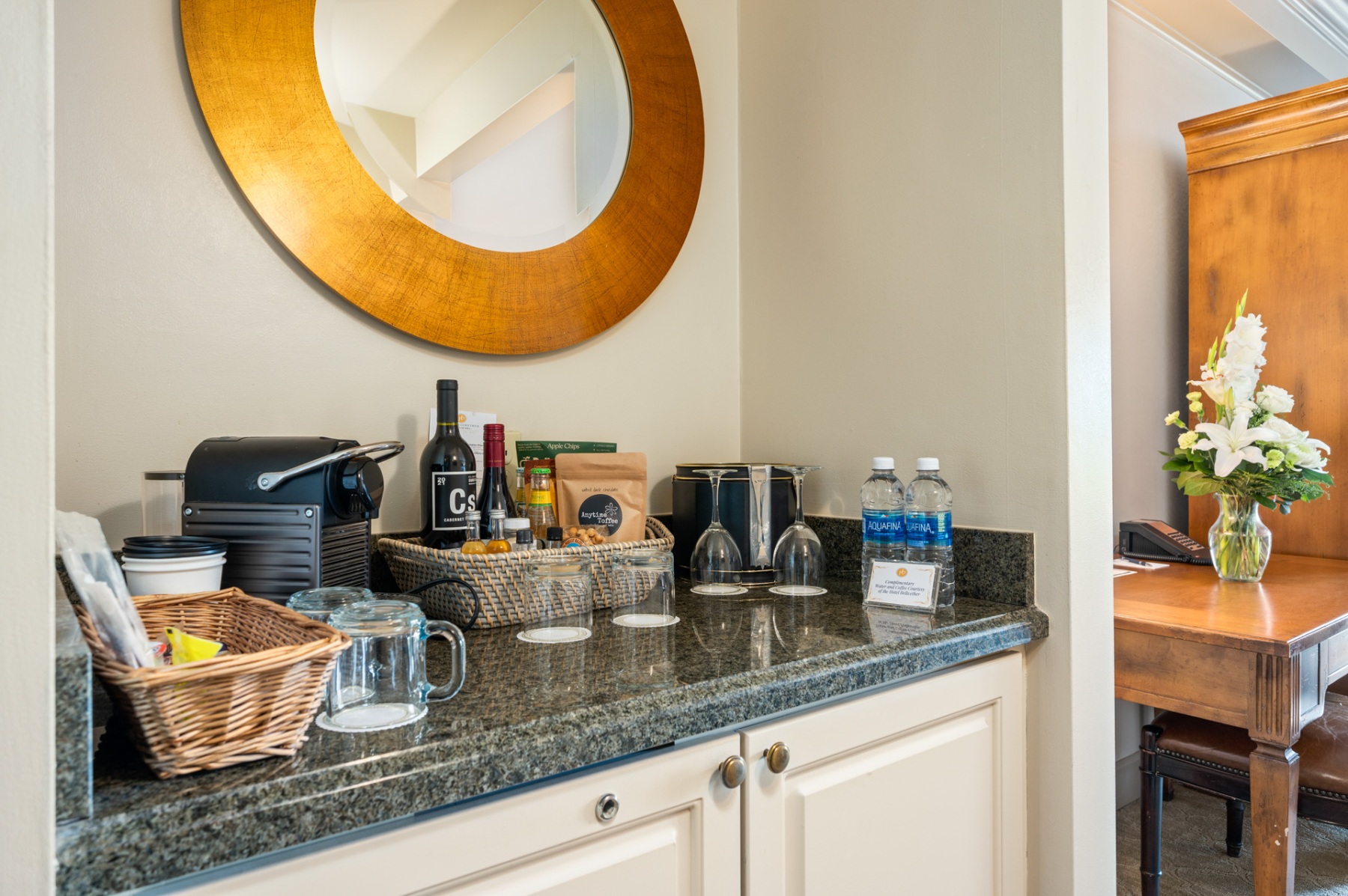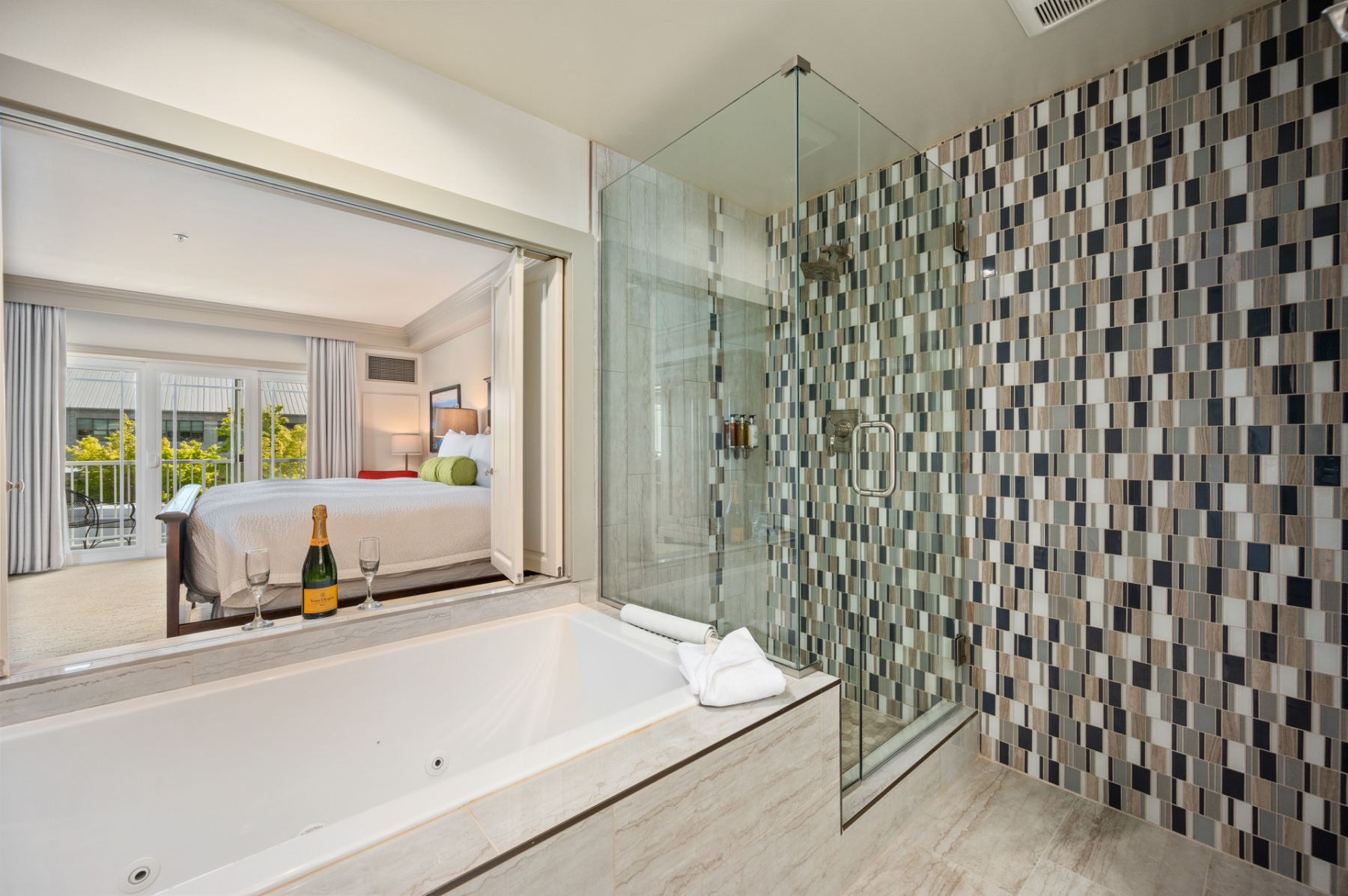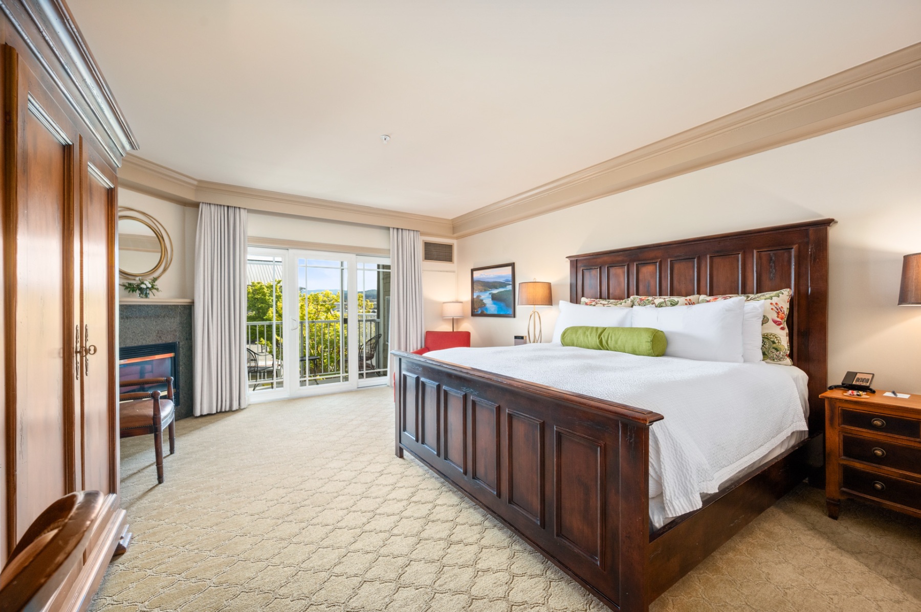 Enjoy one of our luxurious Executive Plaza Rooms with a view of Tom Glenn Plaza with its shops and restaurants. The Executive Plaza rooms feature a king-sized bed with 100% down oversized pillows and comforter. These rooms are equipped with upscale amenities, including a natural gas fireplace, jetted bathtub with separate glass and marble walk-in shower, flat-screen TV with cable and DVD player, and a private patio or balcony. Other luxury amenities include imported Italian furniture, complimentary wireless high-speed internet, mini-fridge, in-room safe, iron, and ironing board.