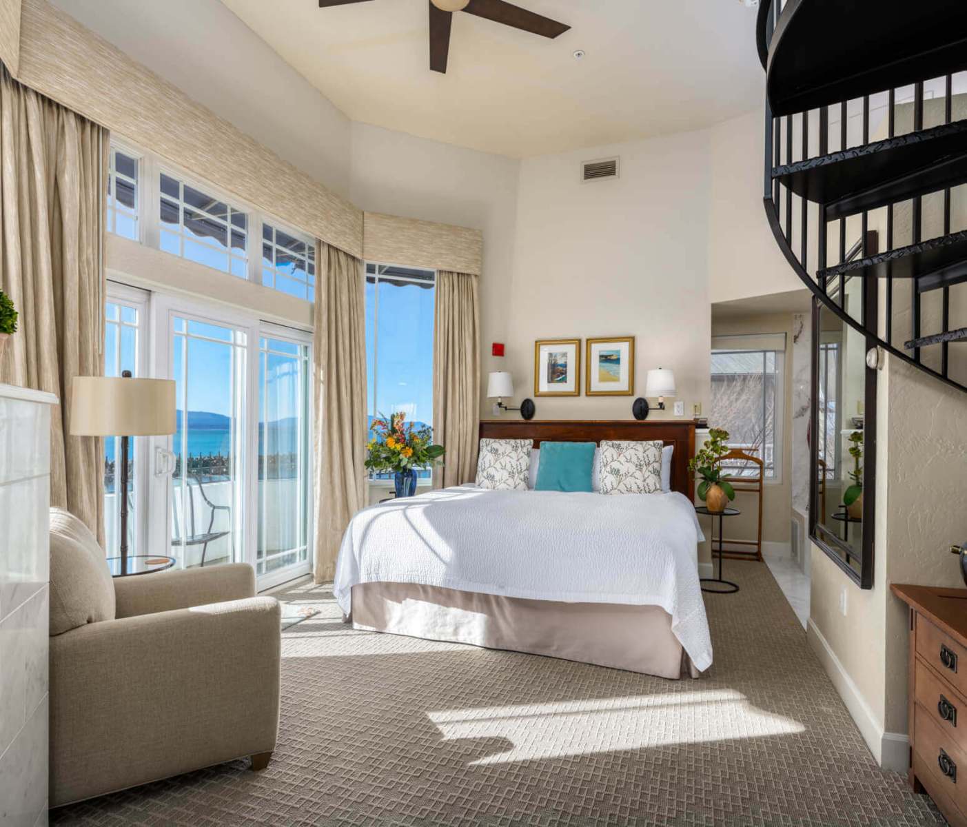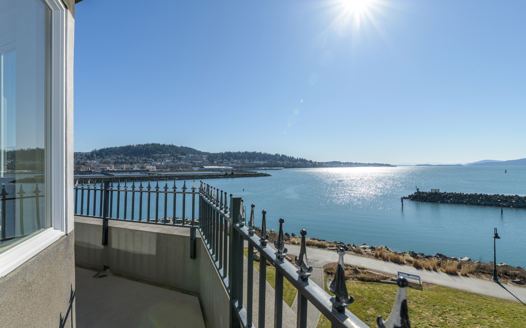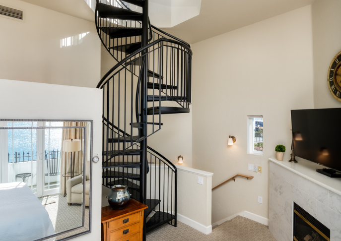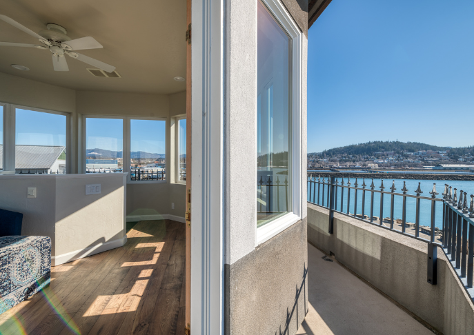 Often noted as one of the Pacific Northwest’s most unique lodging experiences, this three-story Lighthouse replica is a freestanding, 900 square-foot waterfront retreat adorned with nautical art and amenities. This suite is the perfect hideaway for a birthday, anniversary, or wedding night to remember. The first level features a granite breakfast countertop with captain’s chairs, microwave, wet bar, flat-screen TV, half bath, and patio with table and chairs. The second floor boasts a king-sized sleigh bed, flat-screen TV, closet, natural gas fireplace, second-story water-view balcony with chairs, two-person soaking tub, and a large elegant marble bathroom with a separate walk-in shower, toilet, and bidet. Take the spiral staircase to the observation level where you’ll discover plush chairs, a breakfast bar with stools and unmatched 360-degree windows, and a wrap-around terrace overlooking Mount Baker, the San Juan Islands, Squalicum Harbor, the city of Bellingham, and Bellingham Bay. Perched on a grassy peninsula in Bellingham Bay, this is truly the best view in the Northwest any time of year. Come by for a tour! No children or pets.